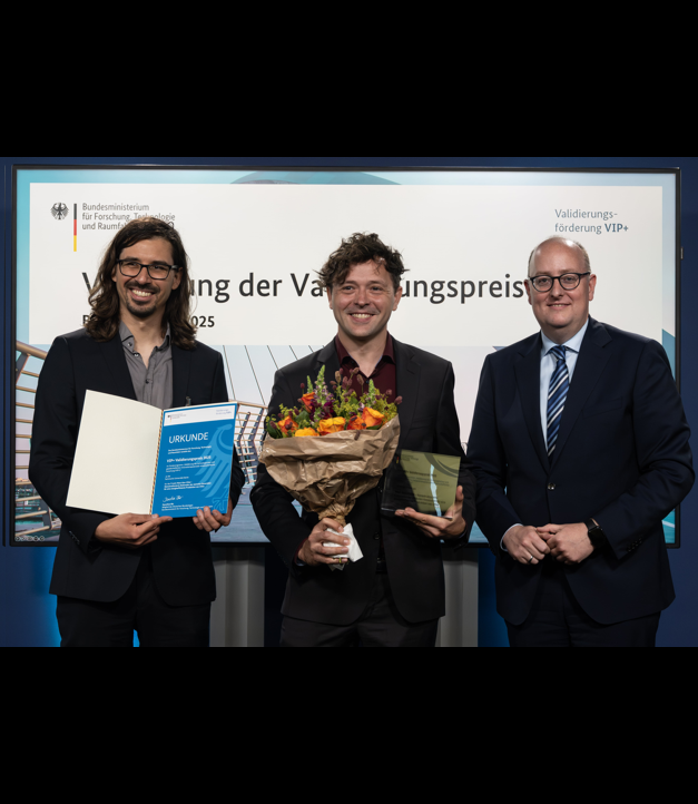 Dr. Michael Bernicke (Nano Cats), Dr. Denis Bernsmeier (Nano Cats), and Matthias Hauer (Parliamentary State Secretary to the Federal Minister for Research, Technology, and Space)©BMFTR/Hans-Joachim Rickel