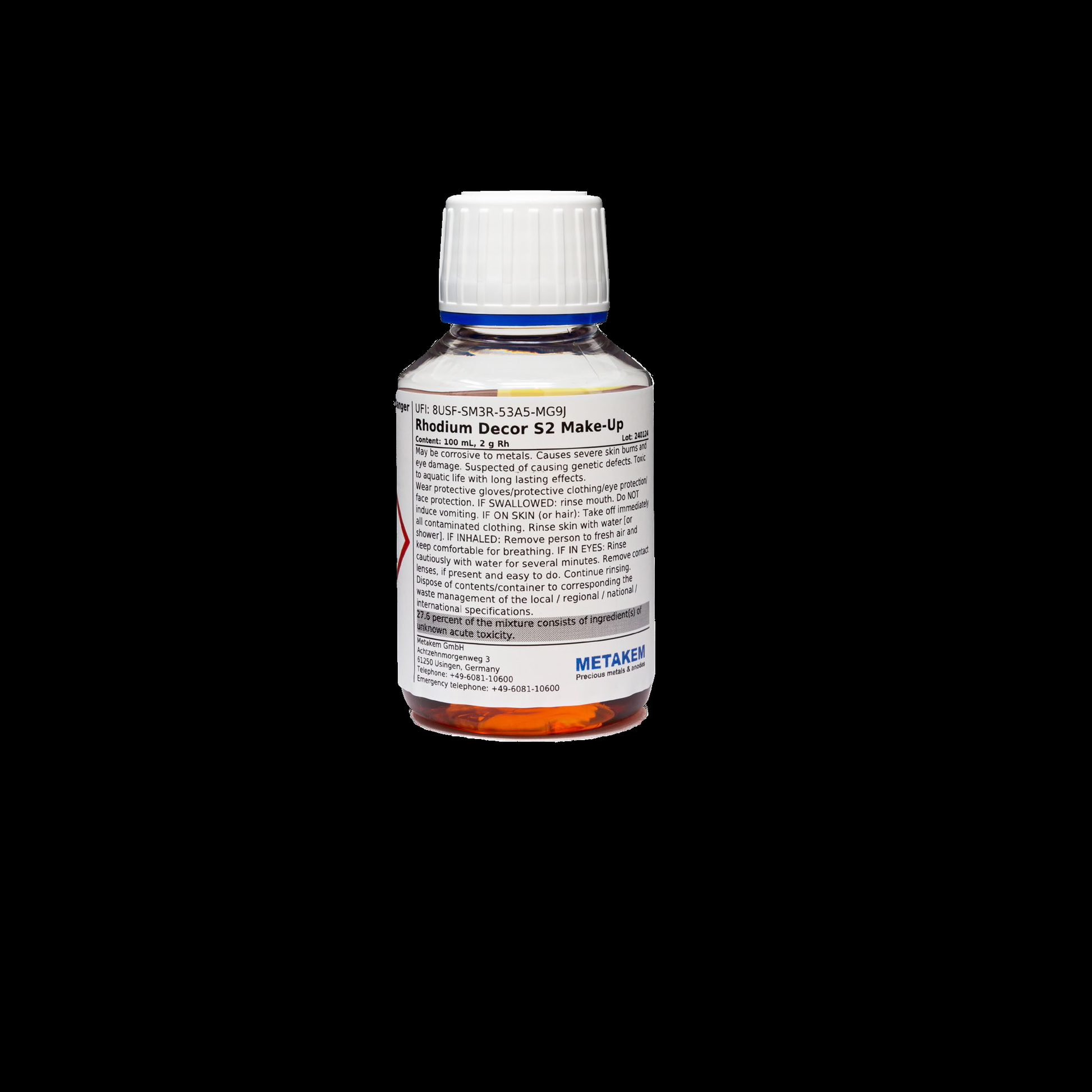- Slowly stir 100 ml of Rhodium Decor S2 stock concentrate with 2 g of Rh into 800 ml of deionized water and then fill up to 1 liter with deionized water.